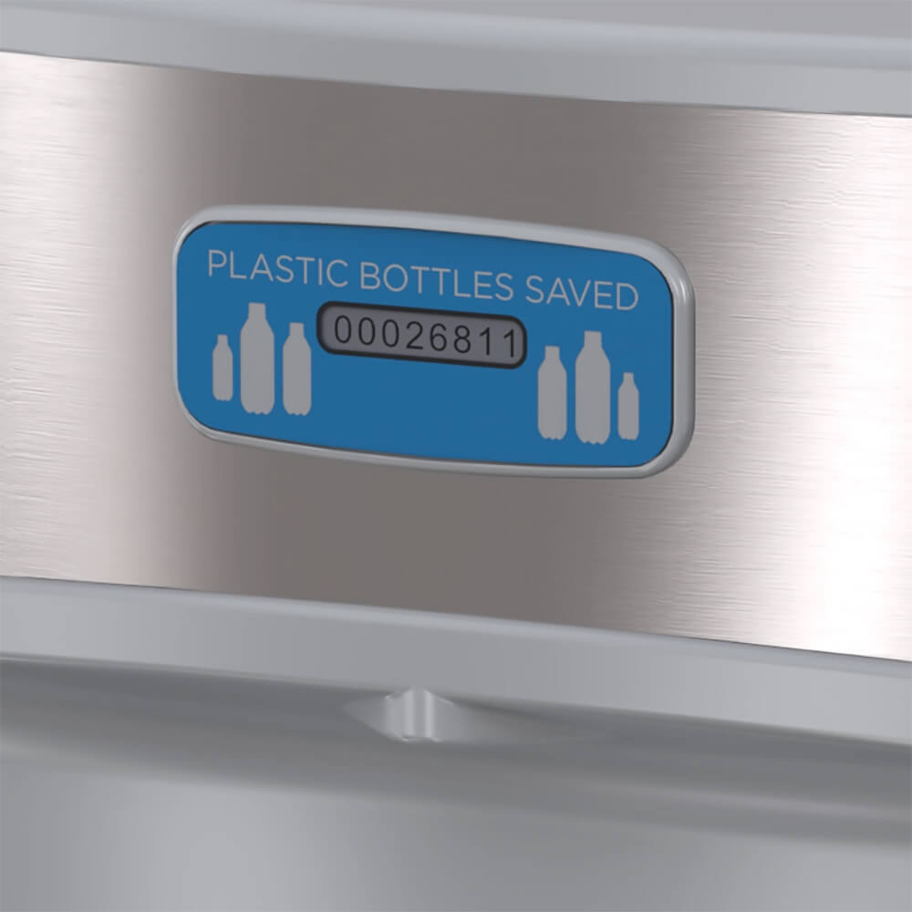 Option -BCD provides a digital Bottle Counter Display indicating the quantity of 16 oz (0.47 liters) disposable plastic bottles saved from a landfill. The option also displays the Water Filter Status and includes LED Light to illuminate and brighten the Bottle Fill area when a Bottle is detected.