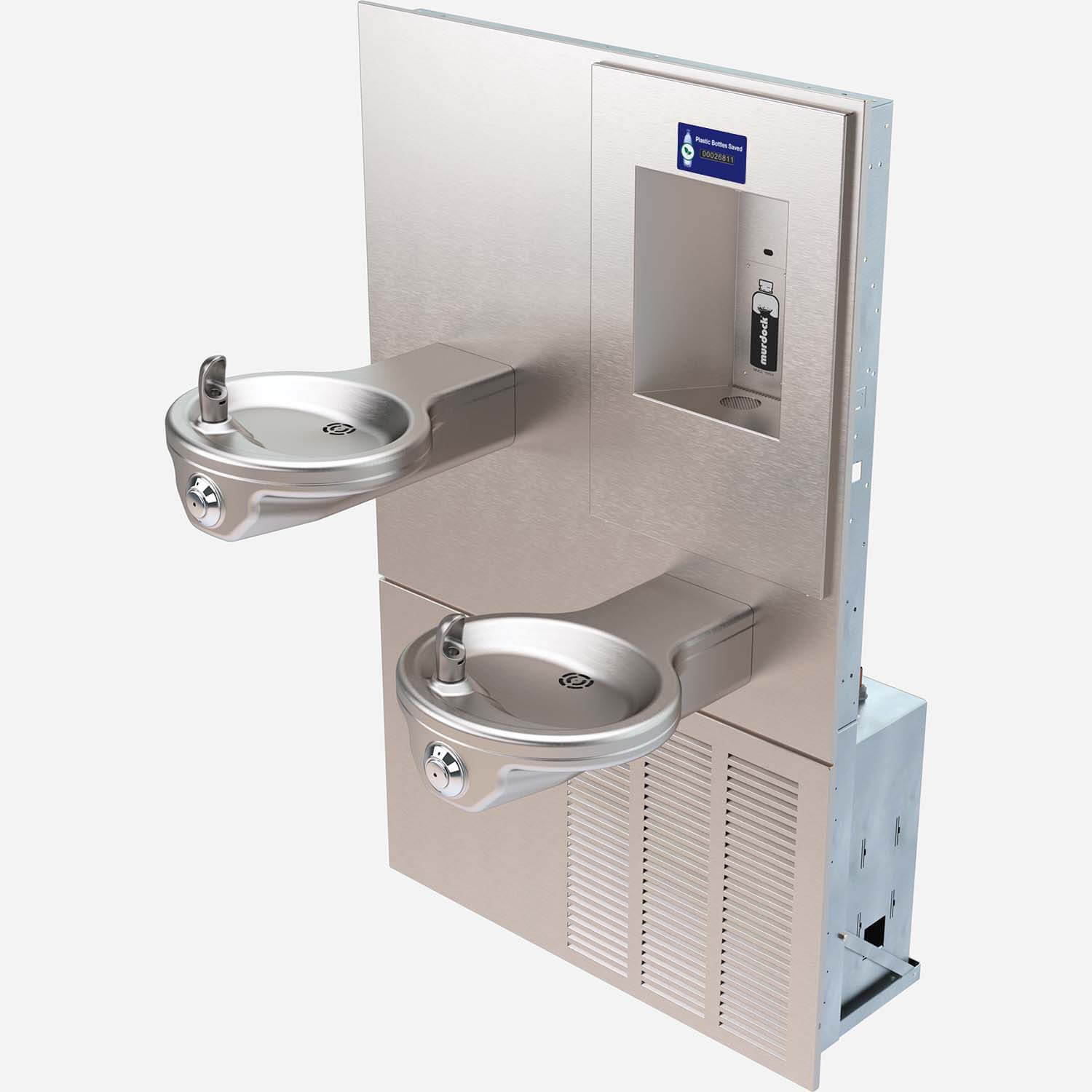 These bi-level drinking fountains with semi-recessed bottle filler are ADA compliant and have in-wall refrigeration. Construction is 18-gauge stainless steel for increased vandal resistance.