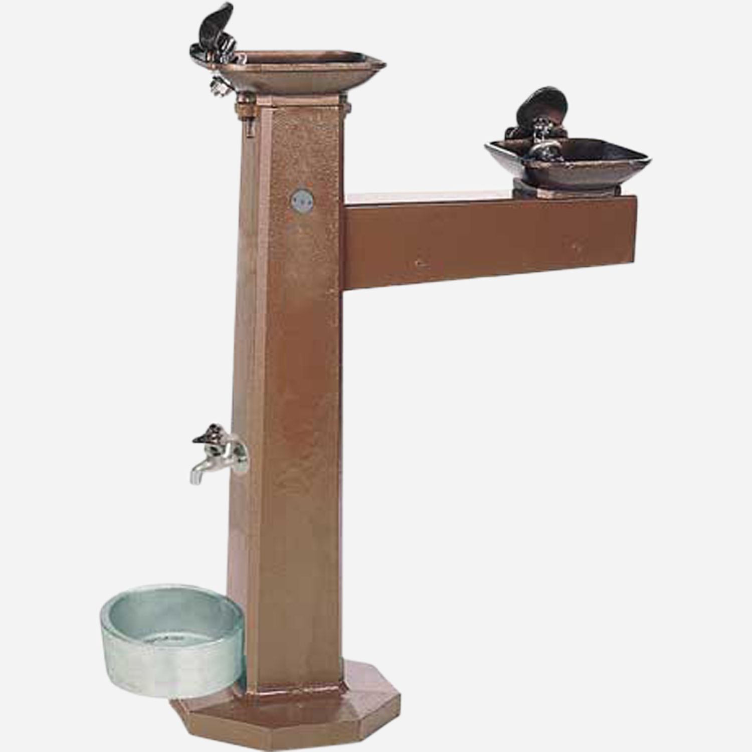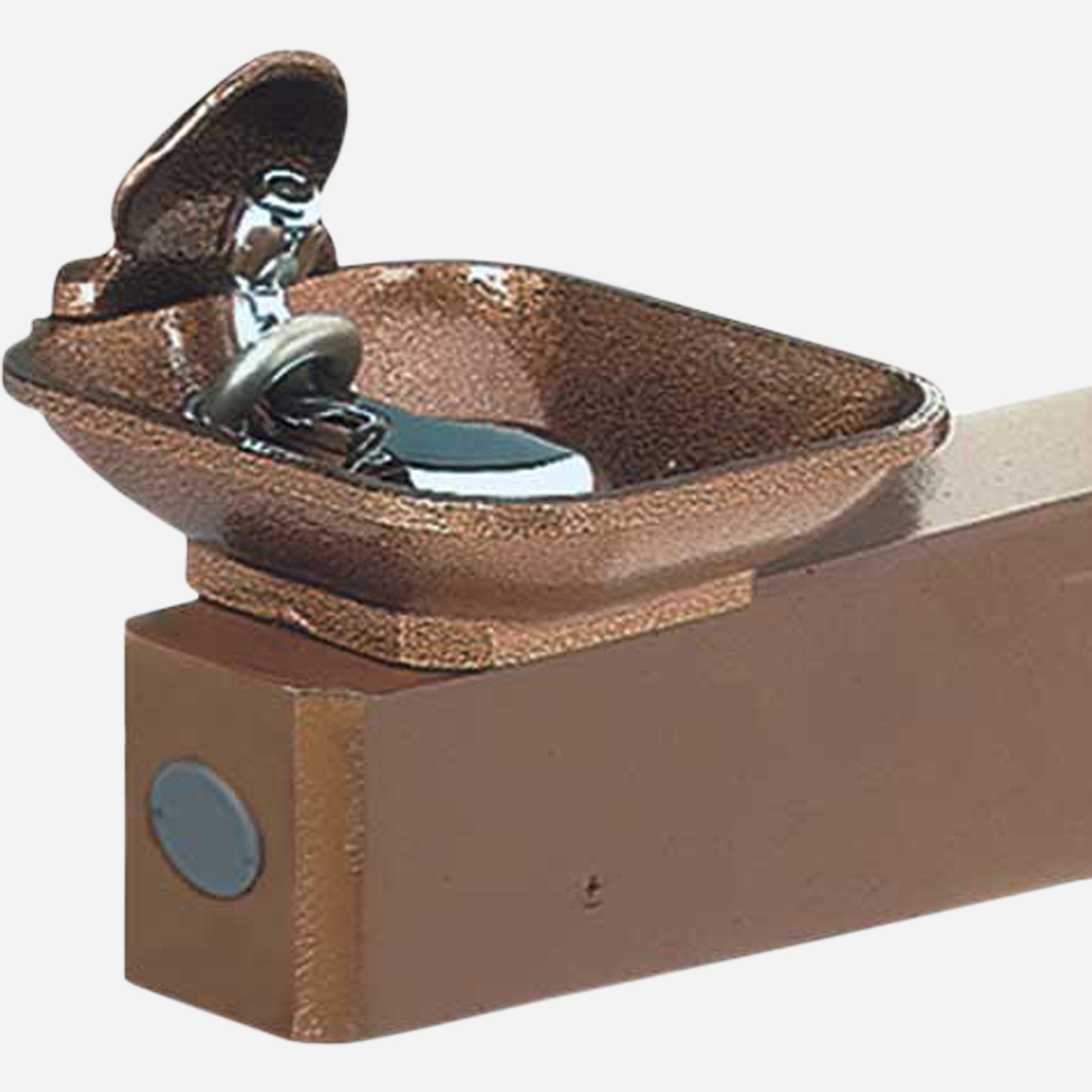 This push button-operated drinking fountain unit has bi-level bowls to meet ADA requirements. Heavy-duty construction ensures durability, and all field-serviceable components are easily accessible. Standard model is seasonal, not freeze-resistant.Solid brass castings for bowl and mouth guard are Penny Vein powdercoated, and the base and arm are finished in Chestnut Brown.