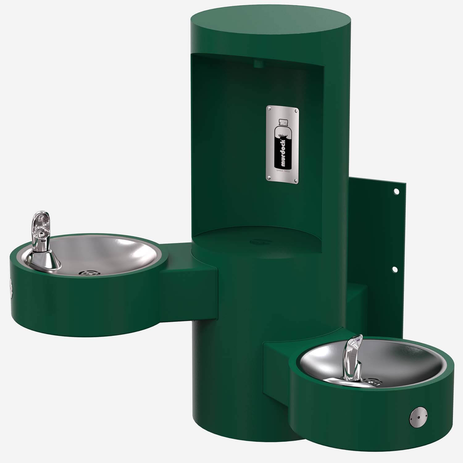 Murdock provides this wall-mounted outdoor bottle filler. Secondary arms from the bottle filler provide a bi-level drinking fountain station. Each arm is mounted 35° from each side of the wall. The lower-mounted drinking fountain services ADA needs.The unit is ideal for a wide range of applications, including schools, cities, parks, stadiums, and more.