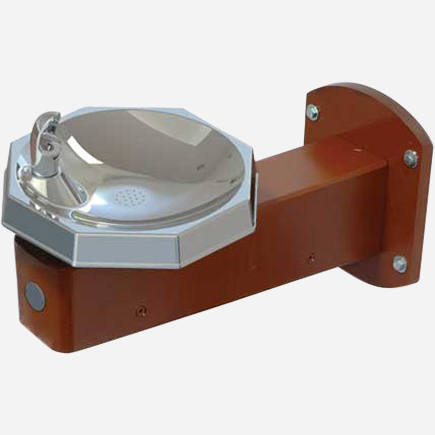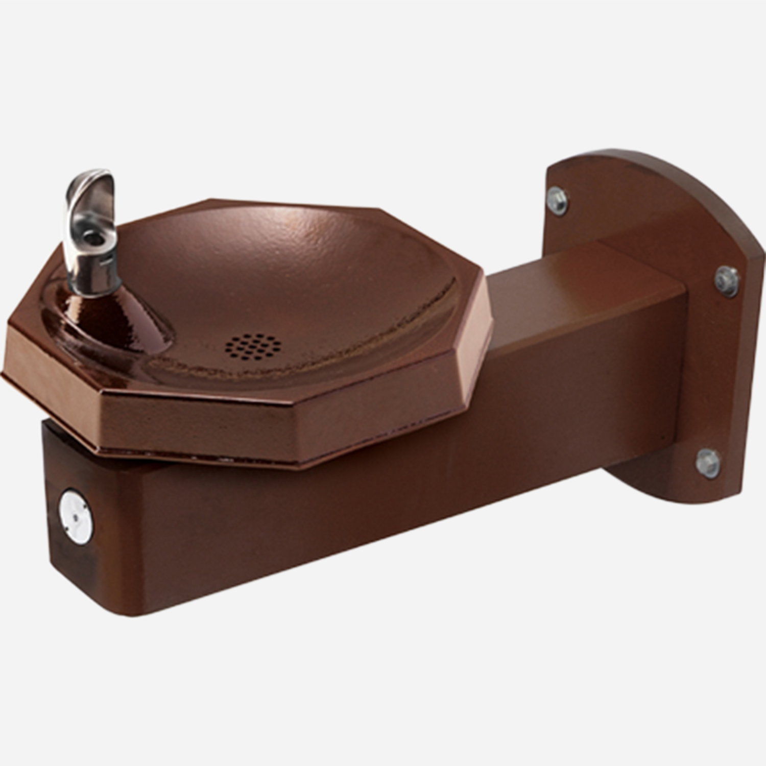 This architectural style fountain features design simplicity. This single fountain has the bowl mounted on an arm and meets ADA requirements for wheelchair users. The fountain includes a stainless steel bubbler and operates by pushbutton control. Standard model is seasonal and not freeze-resistant. Field serviceable components are easily accessible. Solid brass casting for bowl is Penny Vein powder-coated and the arm is finished in Chestnut Brown.