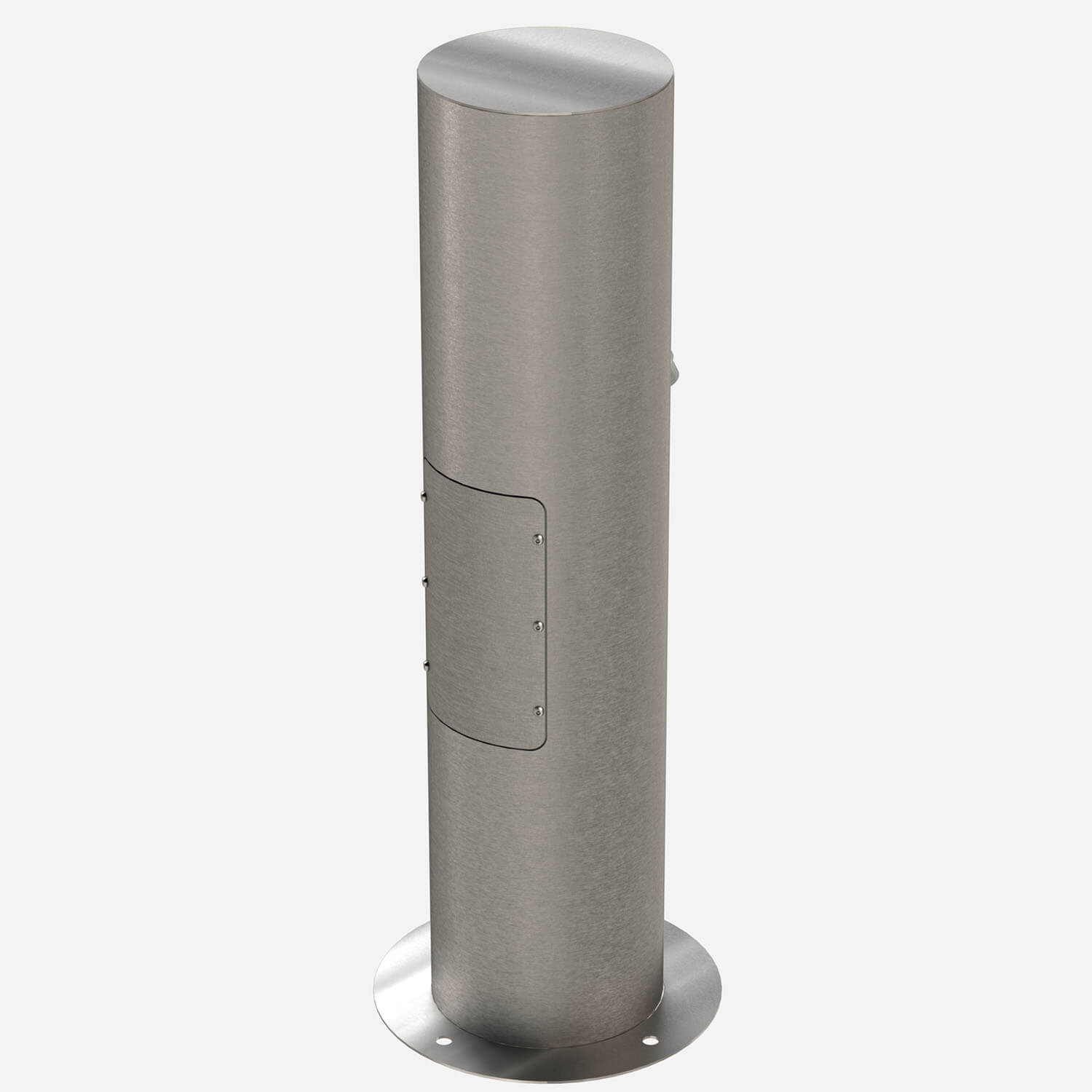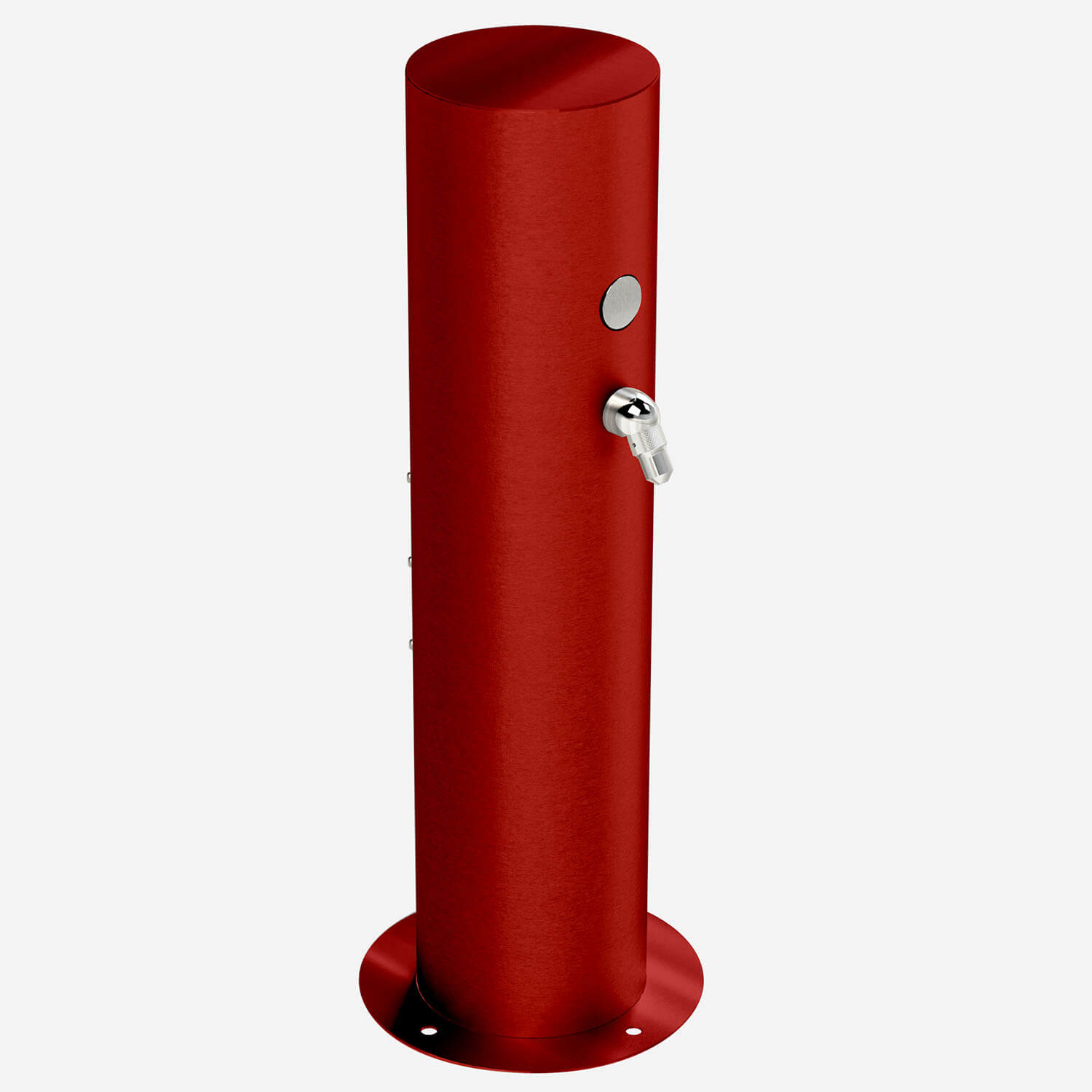 M-FS64 Series is a pedestal cylindrical foot shower. The pedestal measures 29-1/4" (742.95 mm) tall and 7" (177.8 mm) in diameter. A Logan nozzle showerhead is 17-7/8" (454 mm) above grade (orifice height). The pushbutton is approximately 5-3/8" (137 mm) above the showerhead. The fixture is mounted securely with four mounting holes on a 10-1/2" (266.7 mm) diameter base flange. The fixture is manufactured with heavy-duty stainless steel. Standard powder coating colors are available.