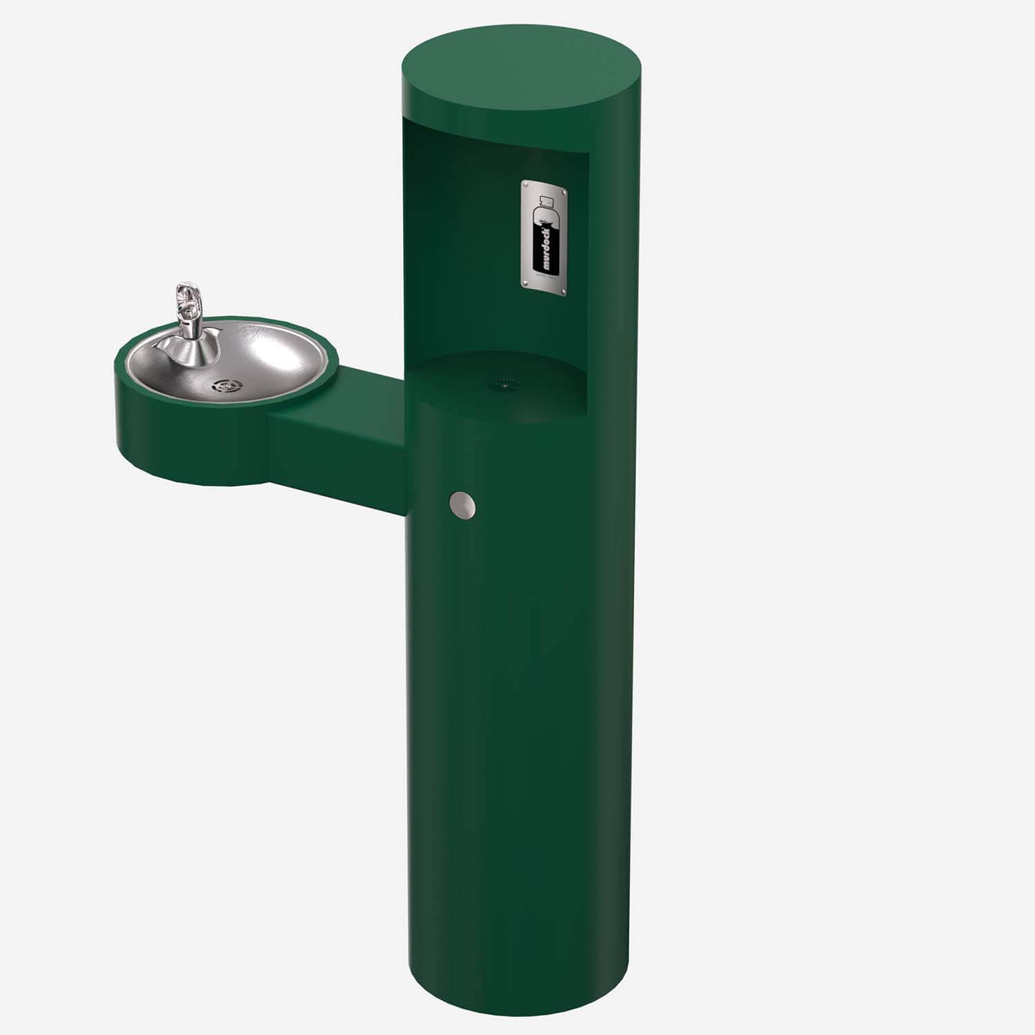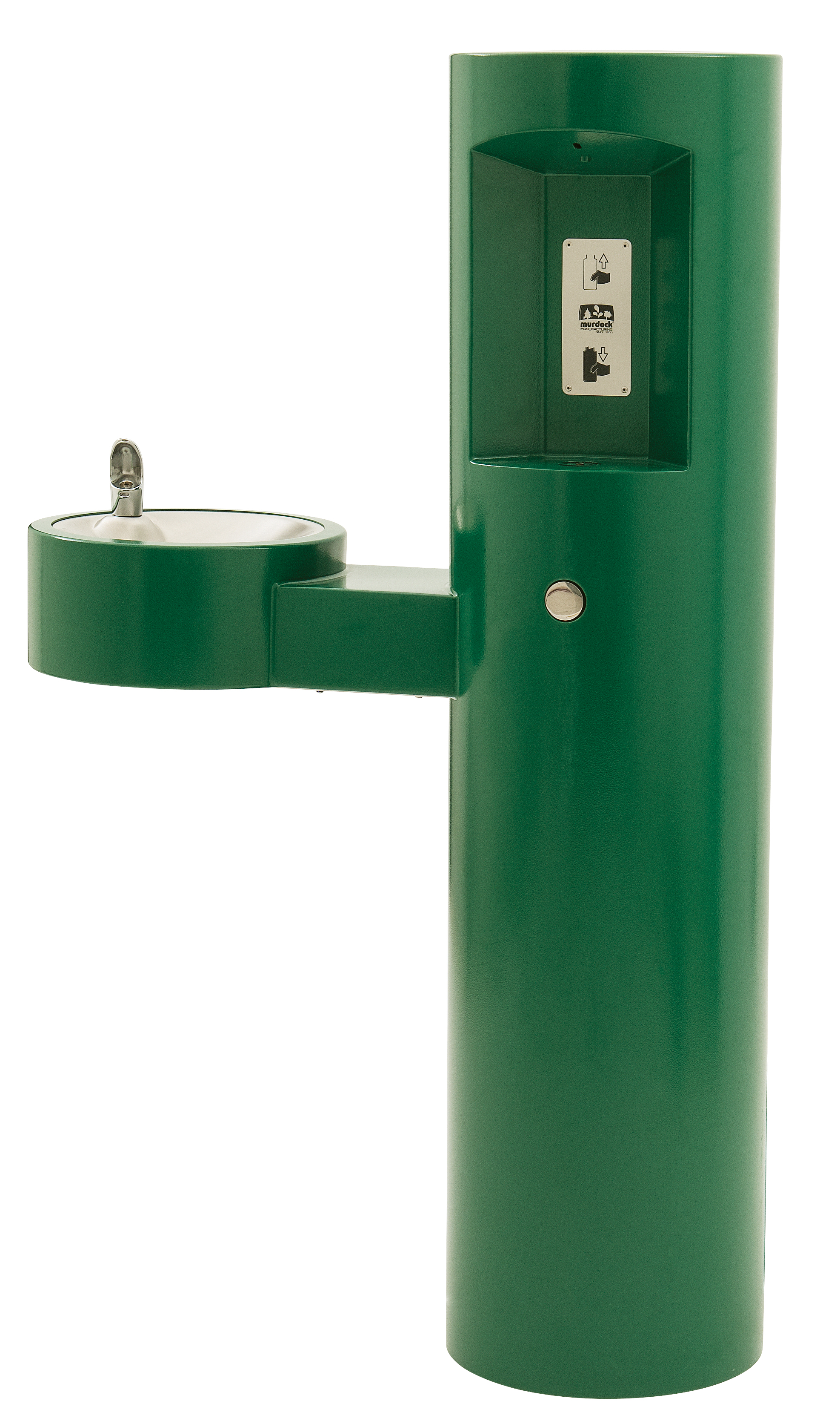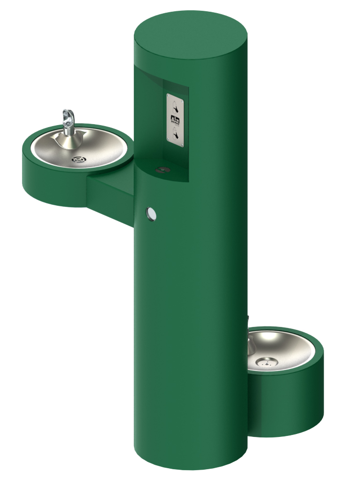 GYM74 Series is an outdoor, pedestal mounted water refill station with a barrier-free arm drinking fountain. Bottle filler shall be activated by a 9 volt sensor or a push button as standard. Unit shall contain a 100 mesh inlet strainer, lead and cyst filter, 6-AA battery pack and laminar flow spout.