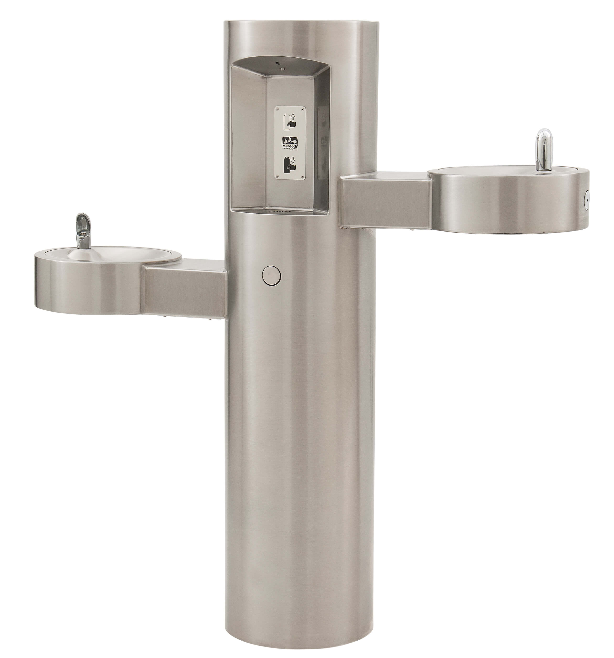 This pedestal-mounted water bottle filling station with bi-level, push button drinking fountains is a parks favorite. Its stainless steel construction makes it resistant to sunlight, heat, moisture, and other wear, and a heavy-duty, vandal-resistant access cover provides additional durability.