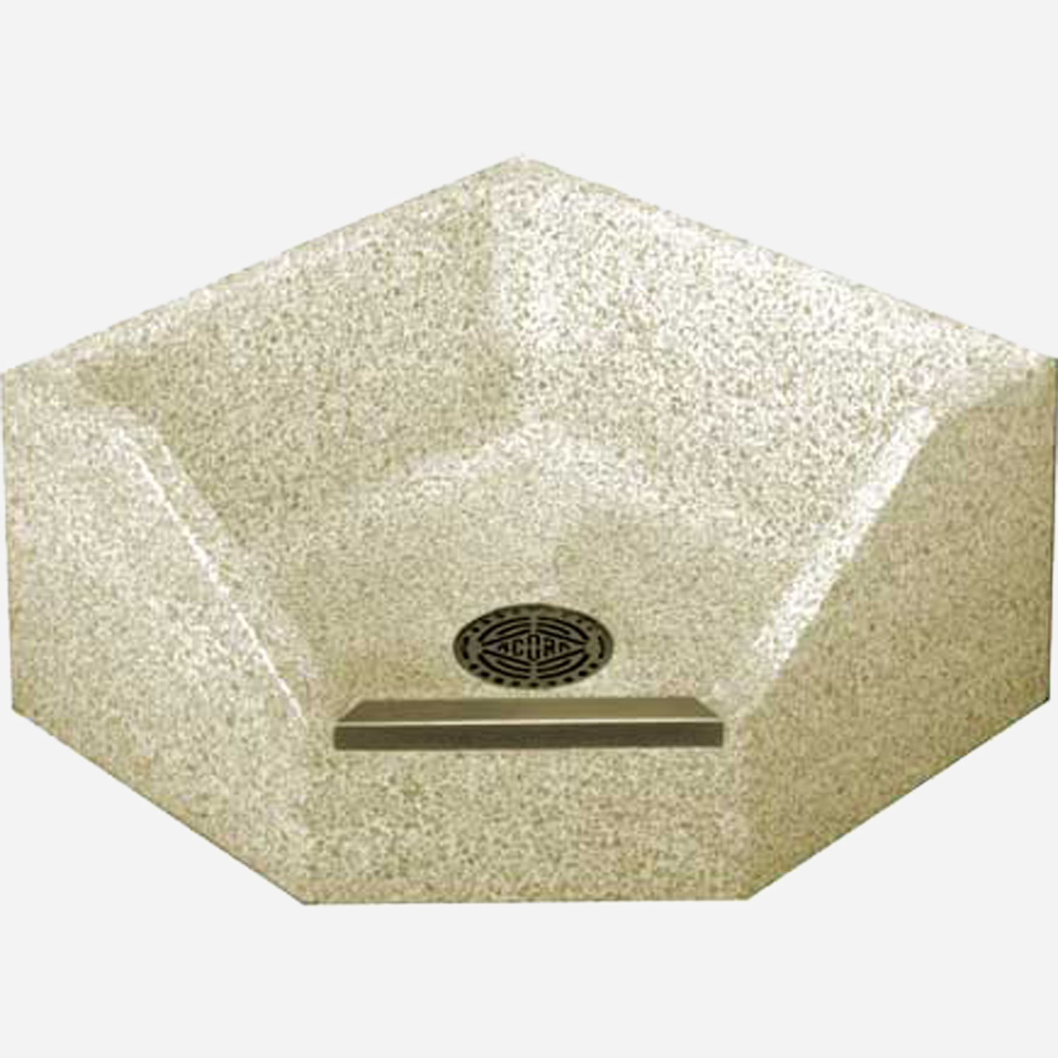 This corner mop sink is an attractive, durable fixture designed to be easy to install and maintain. Precast mop sinks provide flexibility in configuration and size as required by the design of the building and the specific installation. It is constructed of one piece, precast terrazzo with a compressive strength of 3,000 PSI. The drain is integral to the unit and is supplied with a stainless steel grid strainer. The front shoulder is dropped 6" to allow easier bucket tipping. Custom sizes and colors are available.