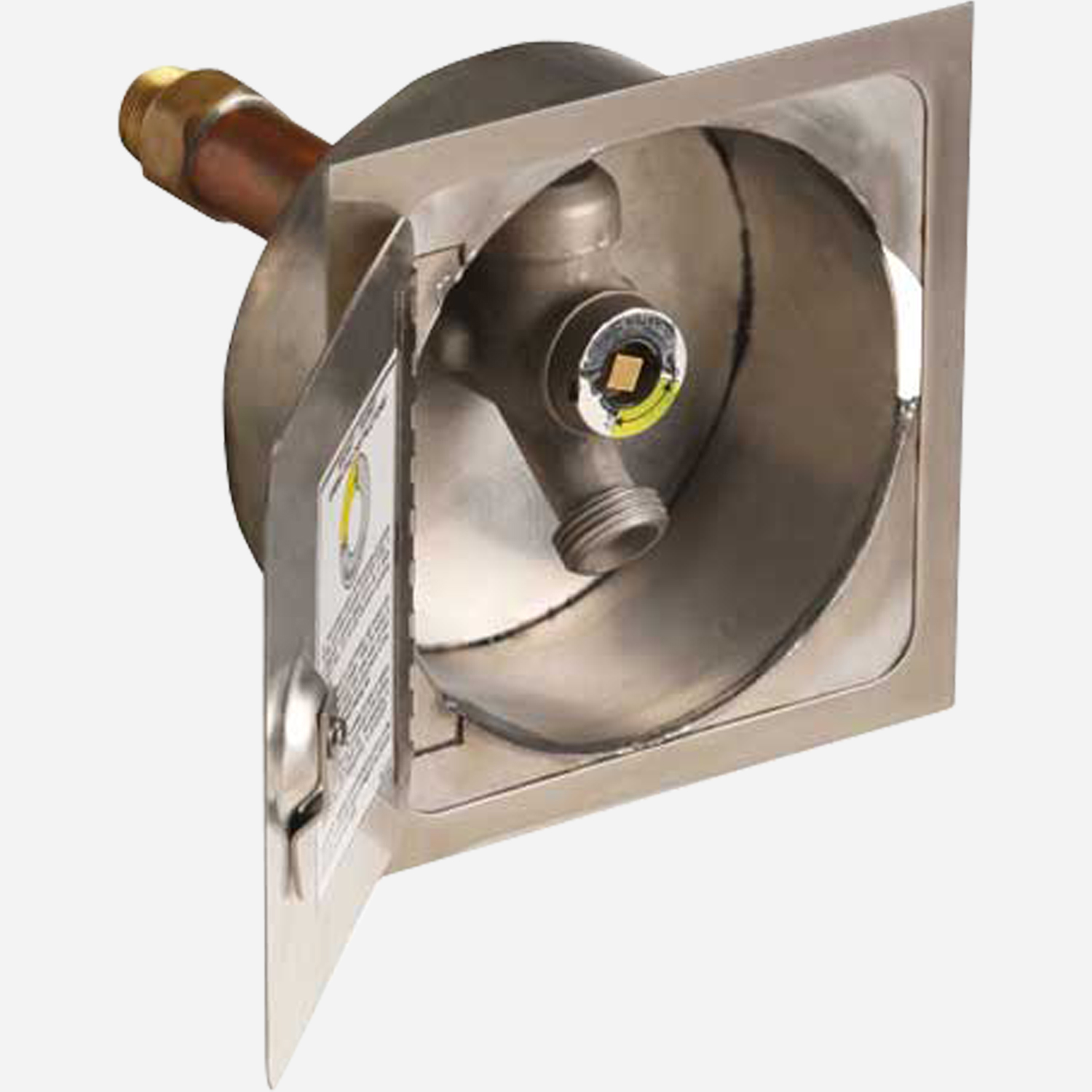 This round box hydrant is designed to fit into a 6” hole drilled into a concrete wall with a 6” diameter core drill saving time and labor. The stainless steel recessed hydrant box conceals the nozzle and operating mechanism of the M-3609QT hydrant making for a clean and simple installation. The stainless steel box comes complete with a vertical hinge avoiding pinched fingers caused by standard horizontal latch type covers. The hinged locking cover opens 180° for clear hydrant access and prevents unauthorized use.