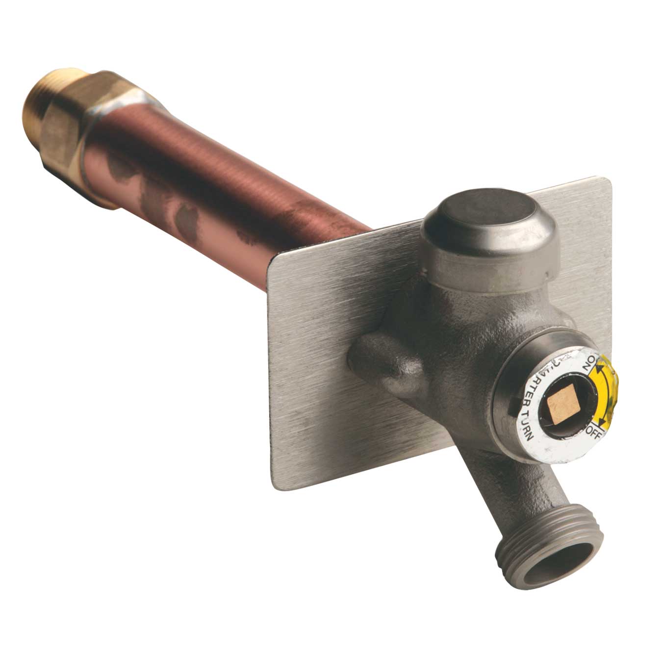 This non-freeze hydrant has a quarter-turn feature that allows for a full flow of water with a 1/4 turn of the key and the integral vacuum breaker provides positive nonfreeze protection when water is required at the outside of the building. The hydrant can be installed in an interior and is adaptable to all types of wall locations.