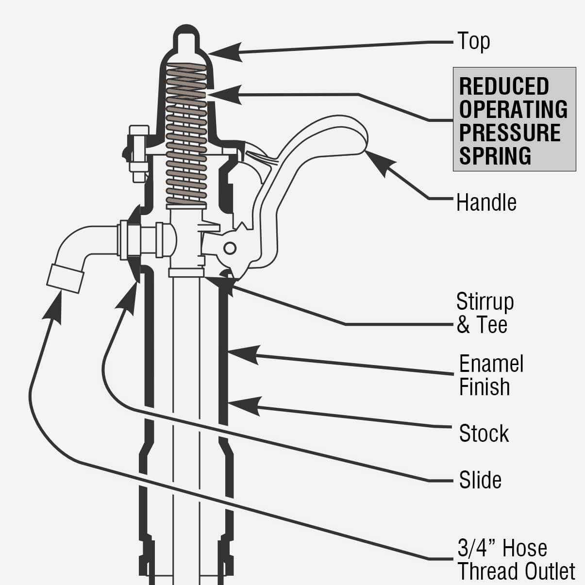 To provide freeze resistant functionality, the control valve is located below the frost line. The reduced-pressure, springloaded handle raises and lowers the internal supply line assembly, controlling the valve. The internal supply column is evacuated through drainage ports in the bottom. The hydrant must be operated fully "ON."
