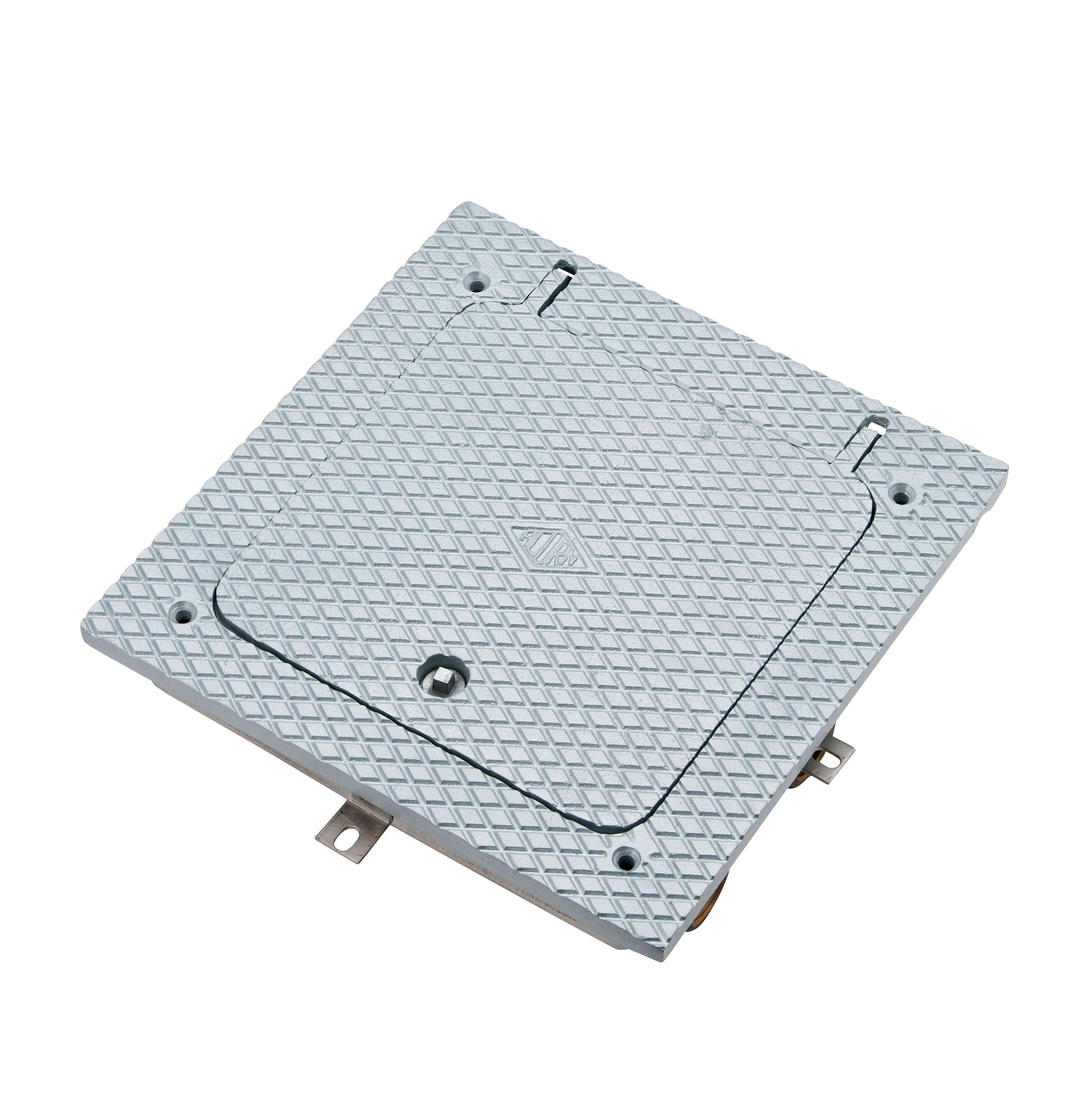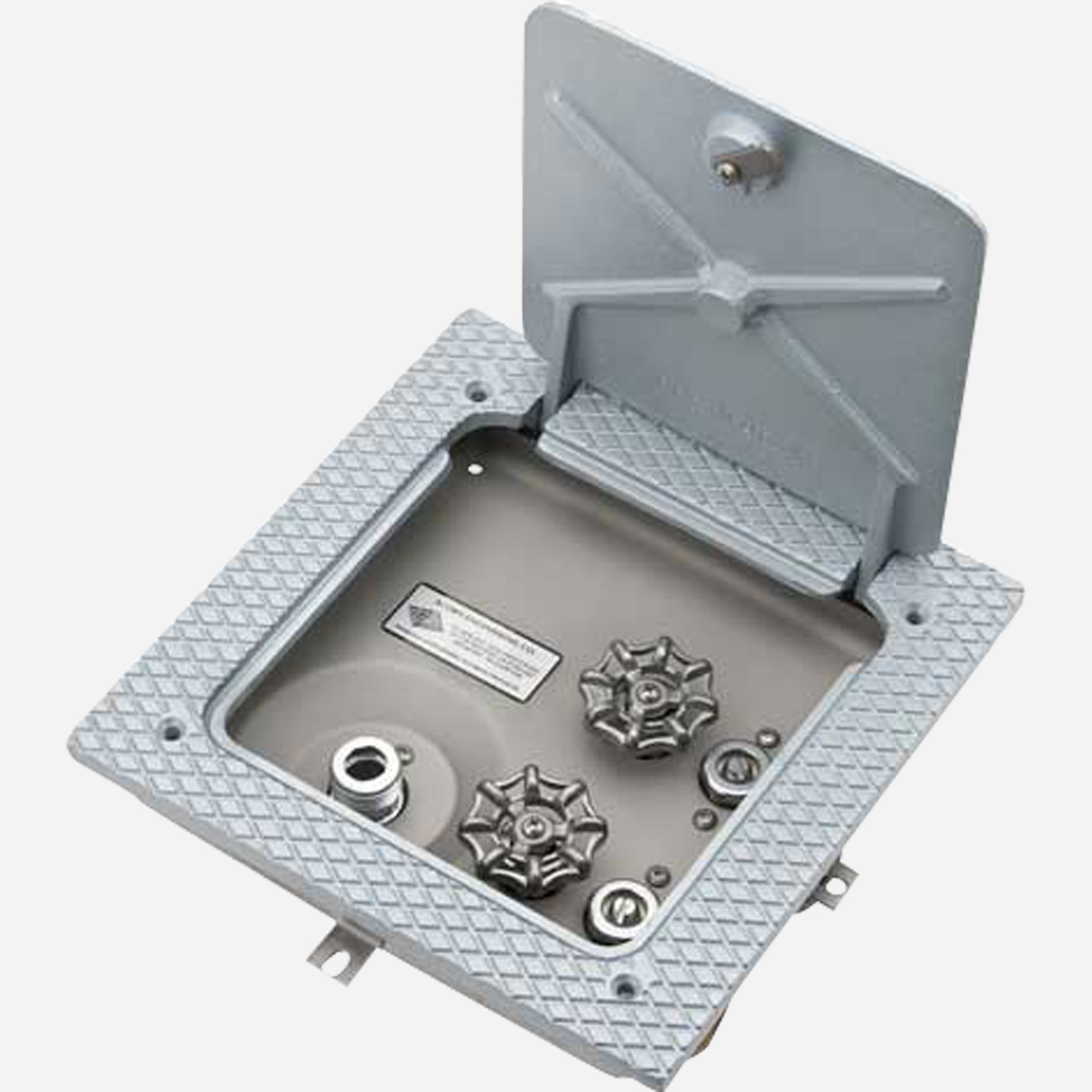 Frame and Door are cast Lumaloy and have a diamond tread non-skid surface. Frame is furnished with four tamper-resistant bolts for anchoring to box. Door is hinged and has a recessed cam latch which is operable with a loose key by others or the removable wheel handle on the valve.