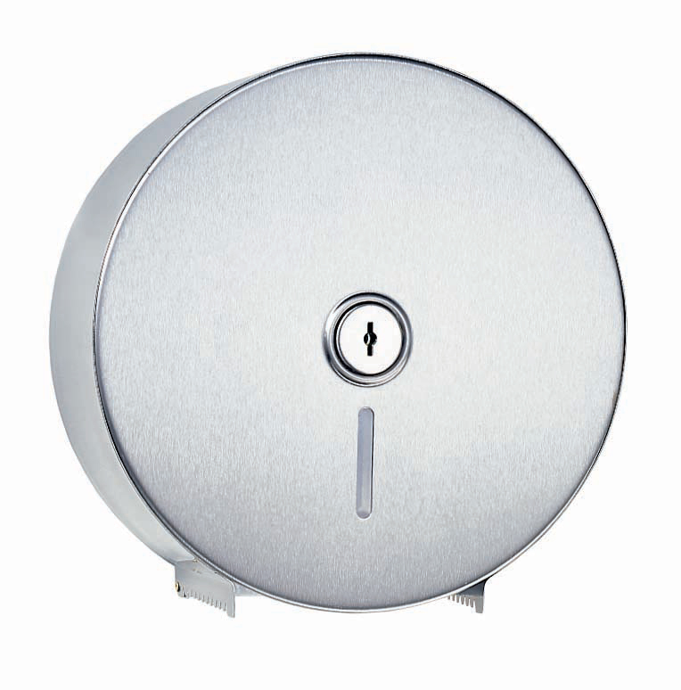 This vandal resistant, wall mounted, jumbo-roll tissue dispenser comes complete with a locking mechanism.