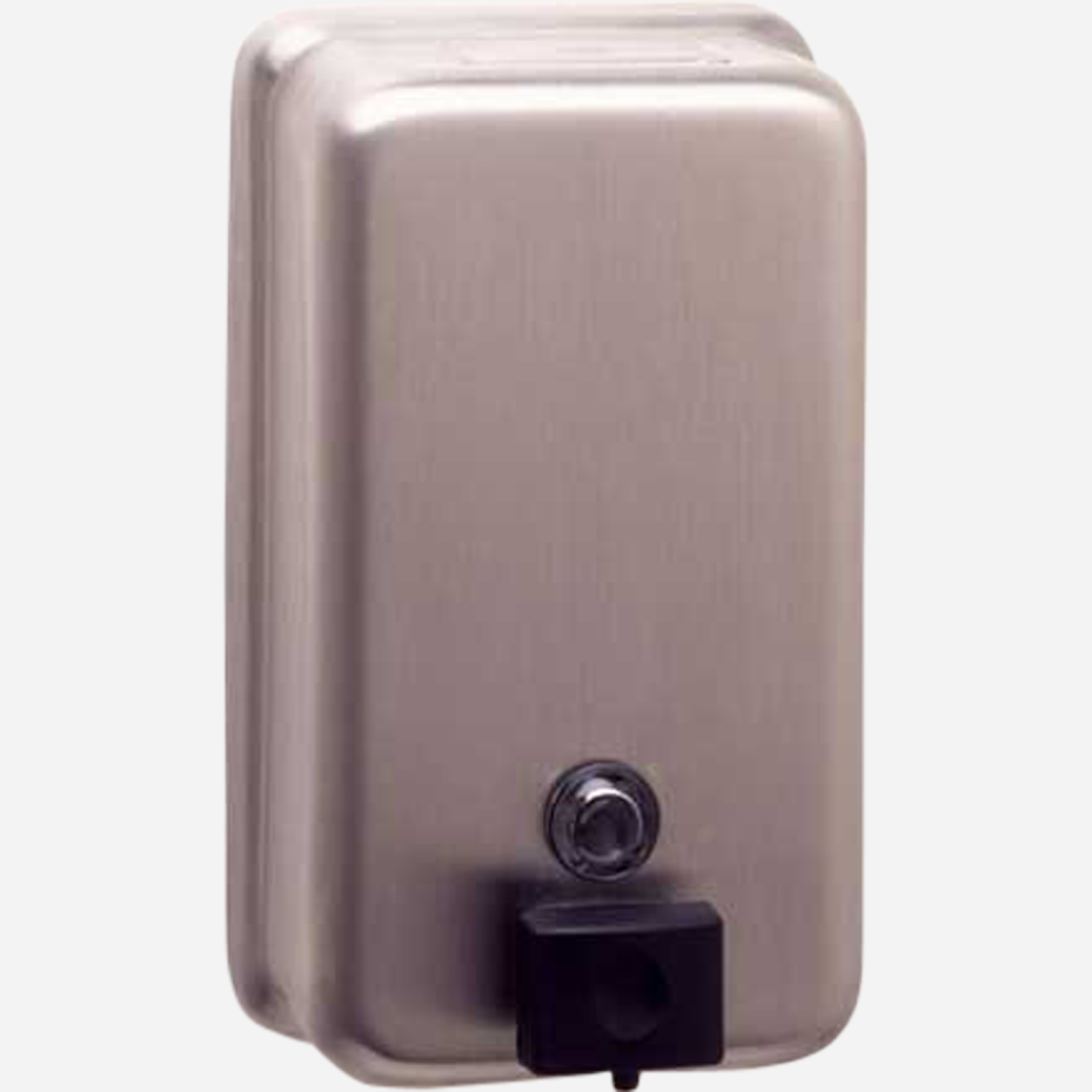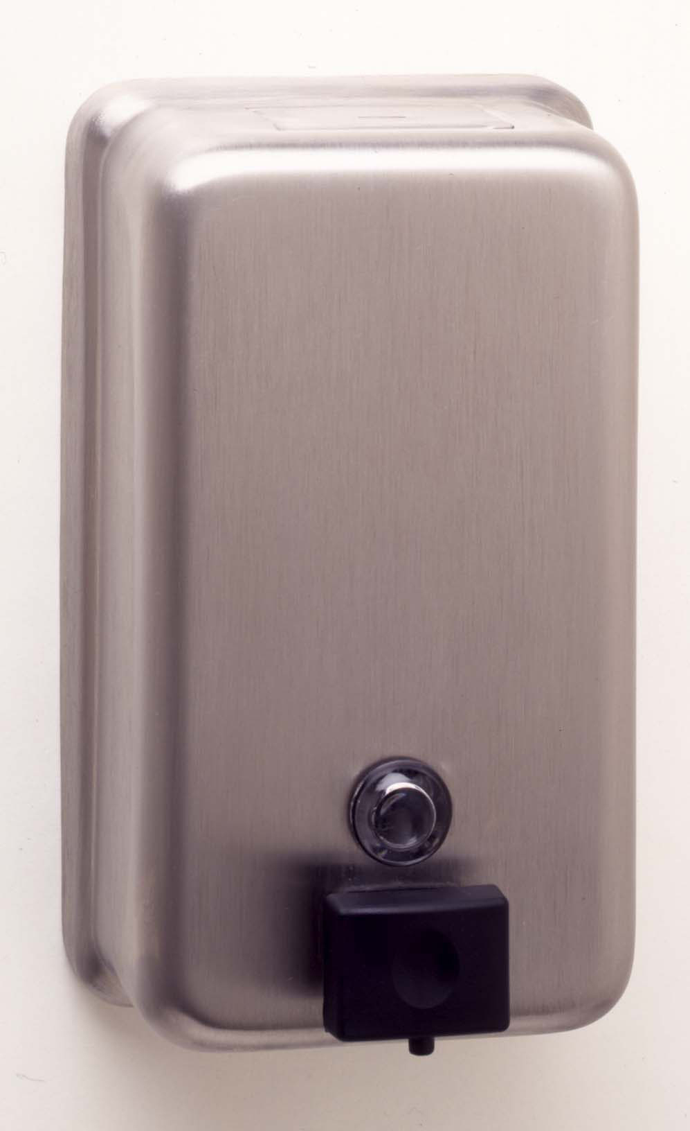 Our soap dispenser is stainless steel construction with unbreakable clear acrylic refill indicator window, a locked hinged stainless steel lid for top filling and a mounting plate with screws. Dispenser has a black plastic push button and spout. Capacity is 40 fl oz. The feminine products dispenser is stainless steel with a hinged stainless steel cover. Disposable paper liners are available.