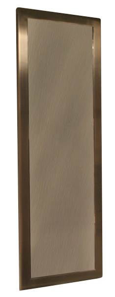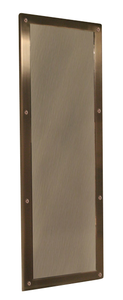 This Super Secur mirror is designed to be installed on a finished wall and mounted from an accessible pipe chase. Mirror and frame are fabricated from stainless steel. The frame has a satin finish while the mirror has been polished to a reflective finish. Included are mounting screws and washers. Options for this model number are front-mount, Enviro-Glaze coating for the frame to add color and shelf.