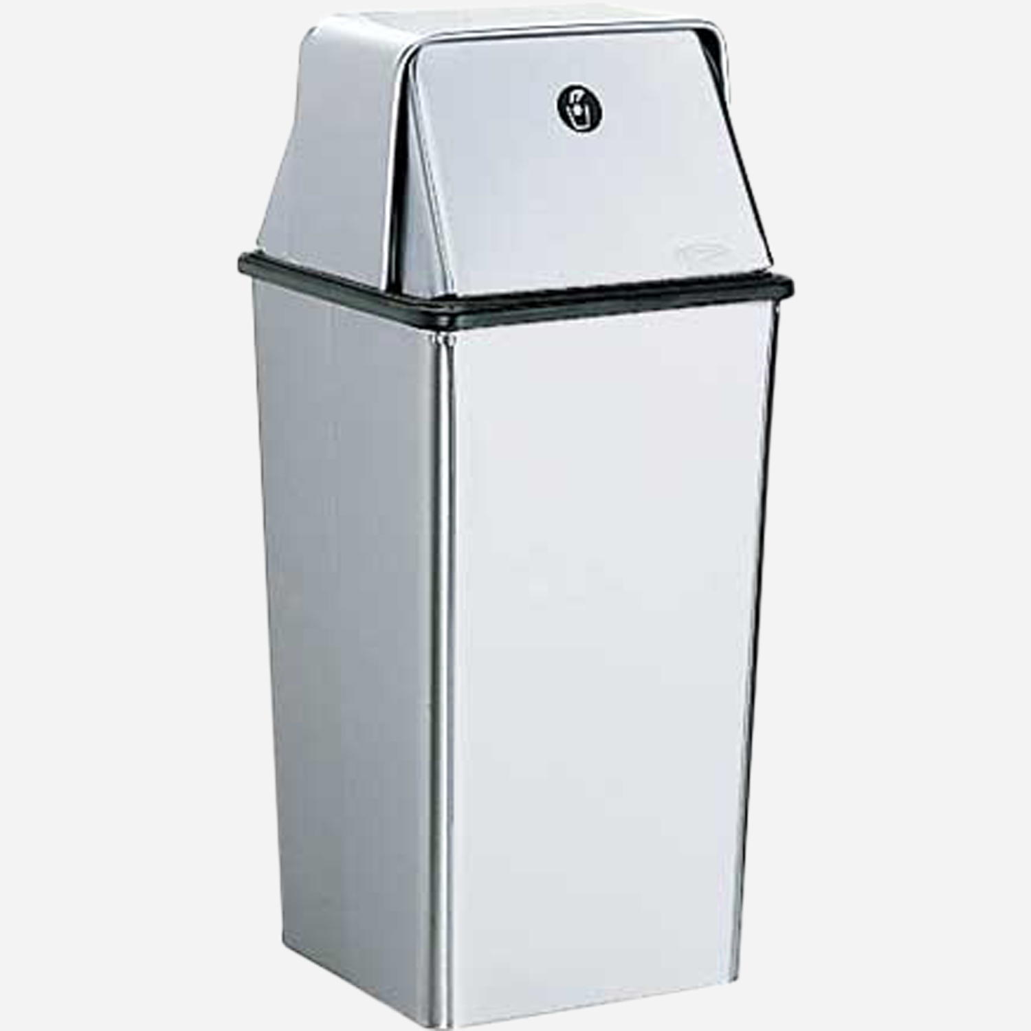 This stainless steel waste receptacle has a vinyl bumper strip and rubber feet. Stainless steel cover has two hinged self-closing doors. Vinyl liners are available.