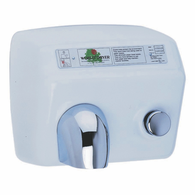 This surface-mounted electric hand dryer is World Dryer model A5. Cover of dryer is 1/4" thick cast iron with a white porcelain enamel finish. It is fitted with a fixed nozzle and has a push button operated drying cycle of 30 seconds. When mounted at the proper height, it is ADA compliant.