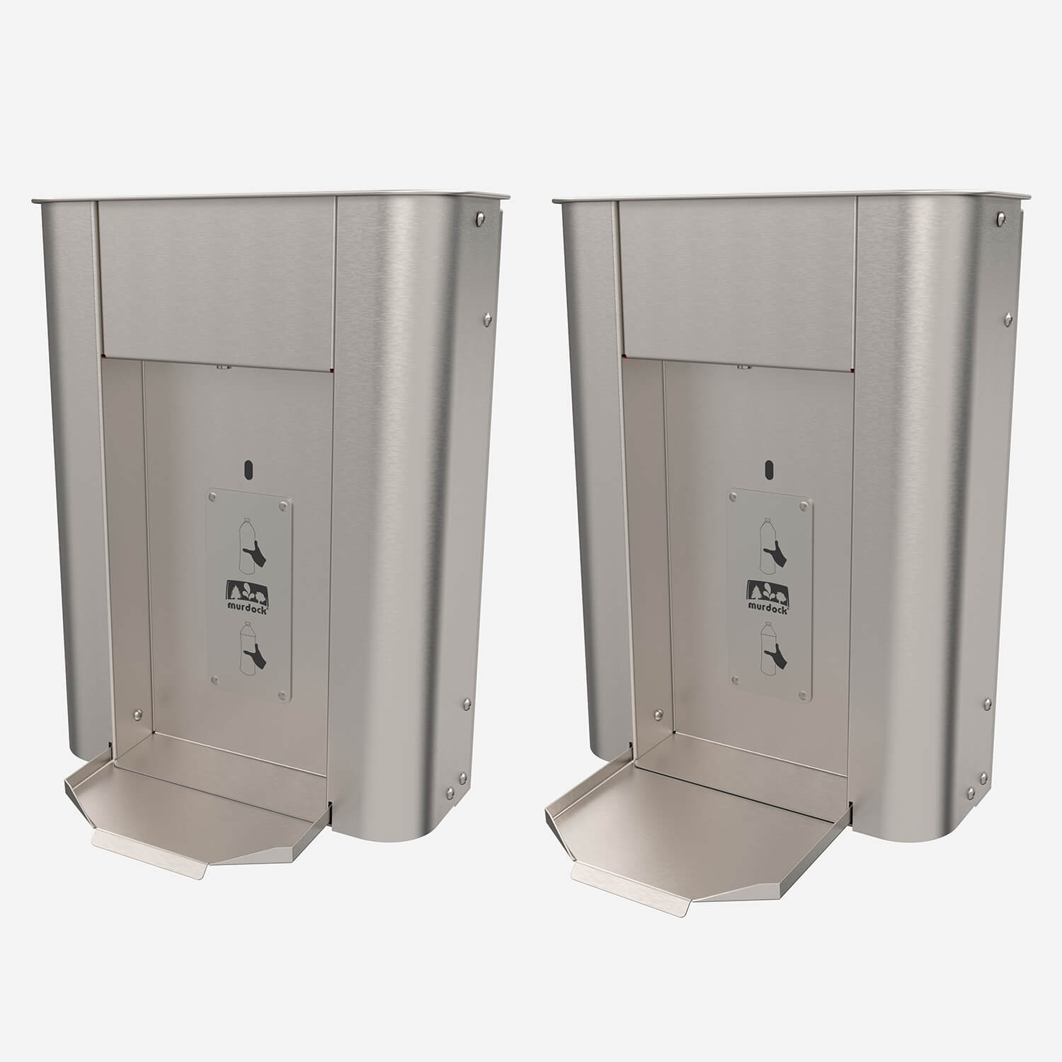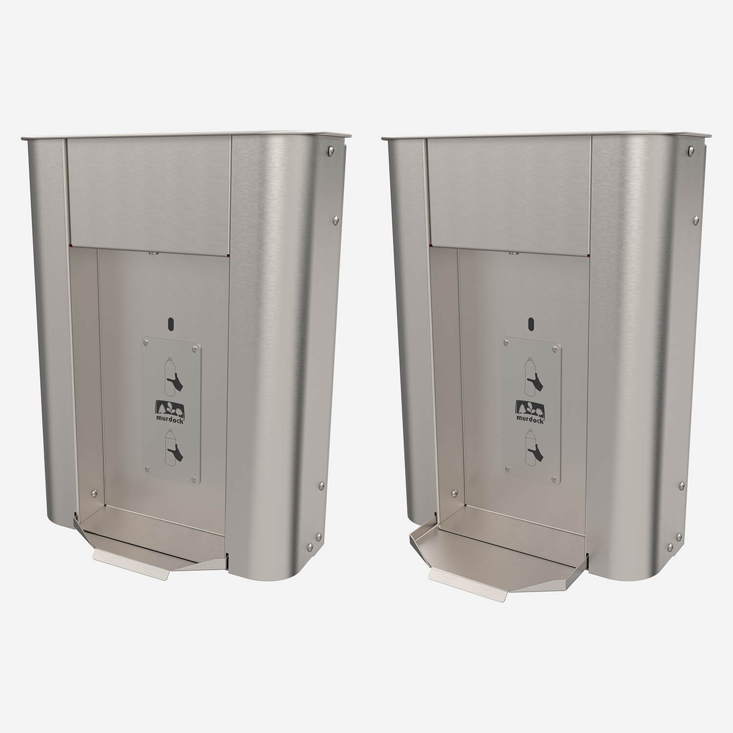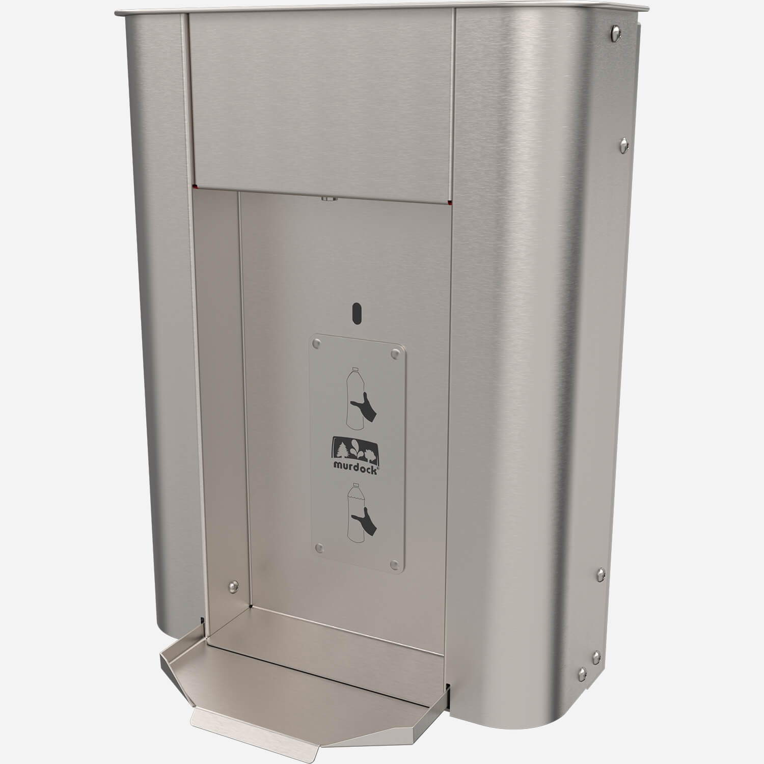 The bottle filler cabinet is fabricated of 18 gauge, type 304 stainless steel. The water for the bottle filler is supplied from the drink fountain on which it mounts. The uncollected water spills a tray which directs the water to the drain of the drinking fountain. To accommodate Murdock and comparable drinking fountains, two trays are provided - installed on the bottle filler one tray measures 5 to 7" (127 to 178 mm) from the back of the drinking fountain. The other measures 7 to 9" (178 to 229 mm).